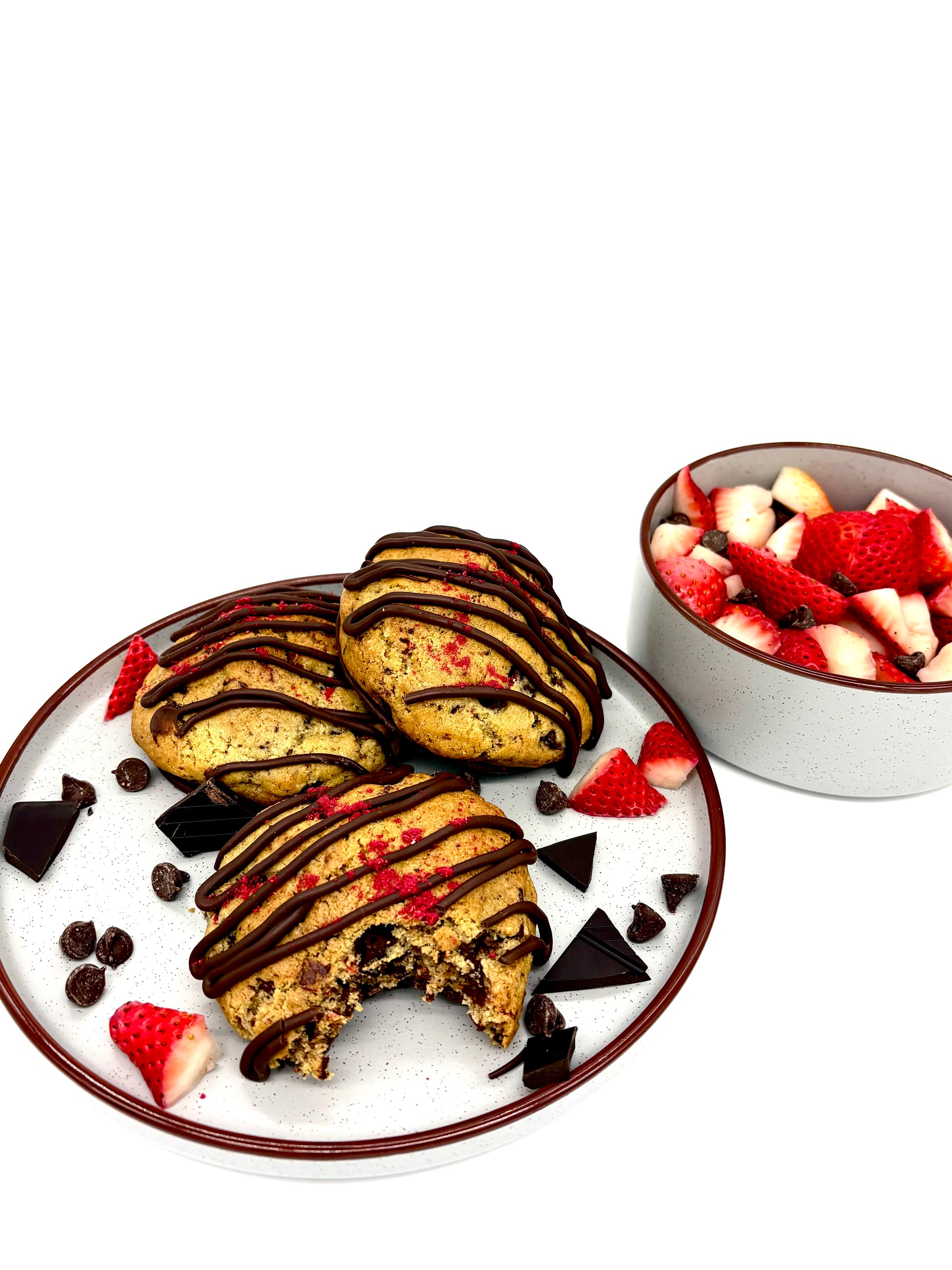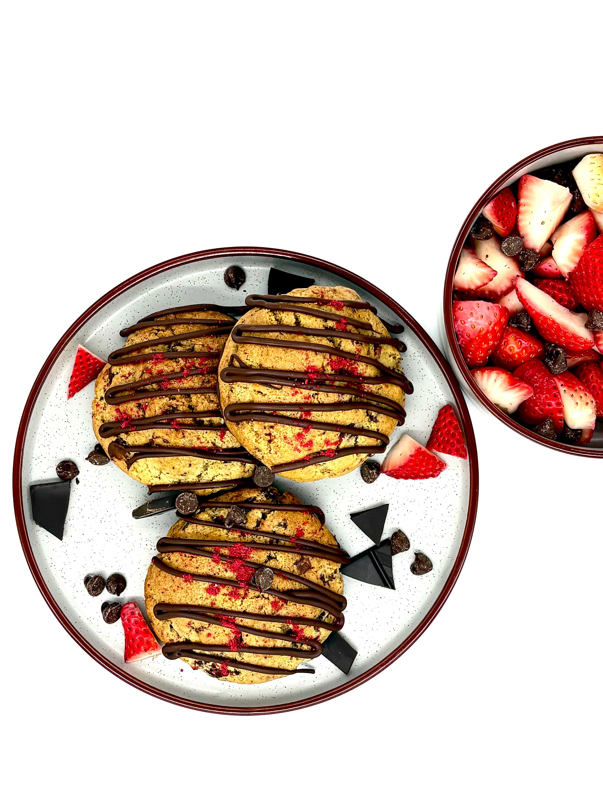A soft, buttery cookie is packed with dark chocolate chunks and bursts of freeze-dried strawberries, then coated in chocolate on the bottom for that classic snap. Finished with a silky chocolate drizzle and a dusting of strawberry crumble on top, every bite is sweet, fruity, and deeply chocolatey. It’s Valentine’s Day energy in cookie form.