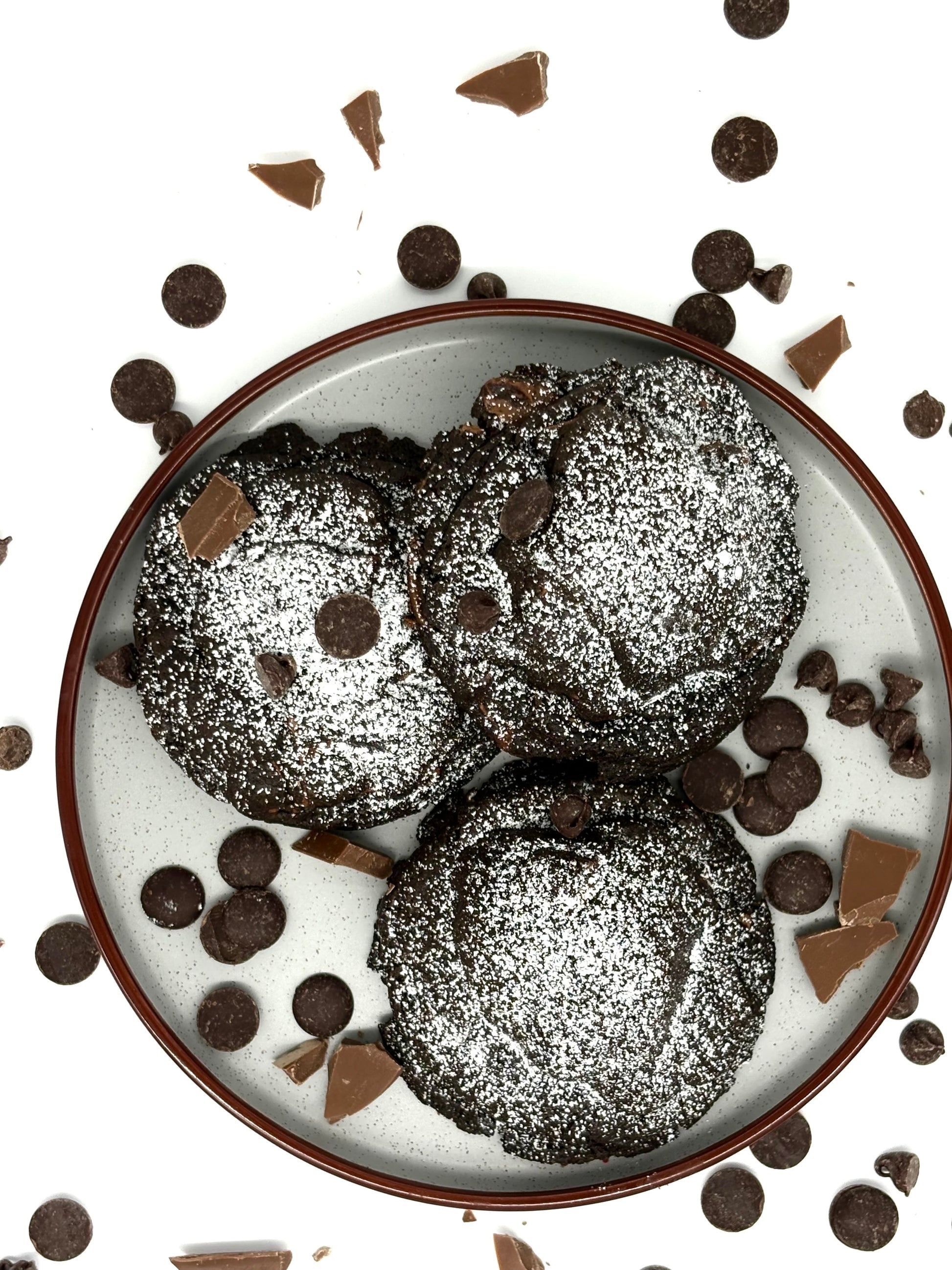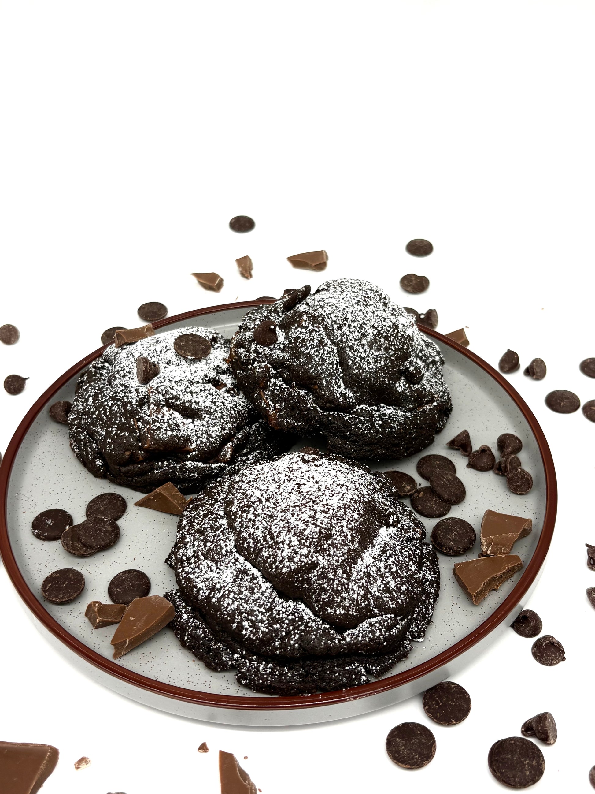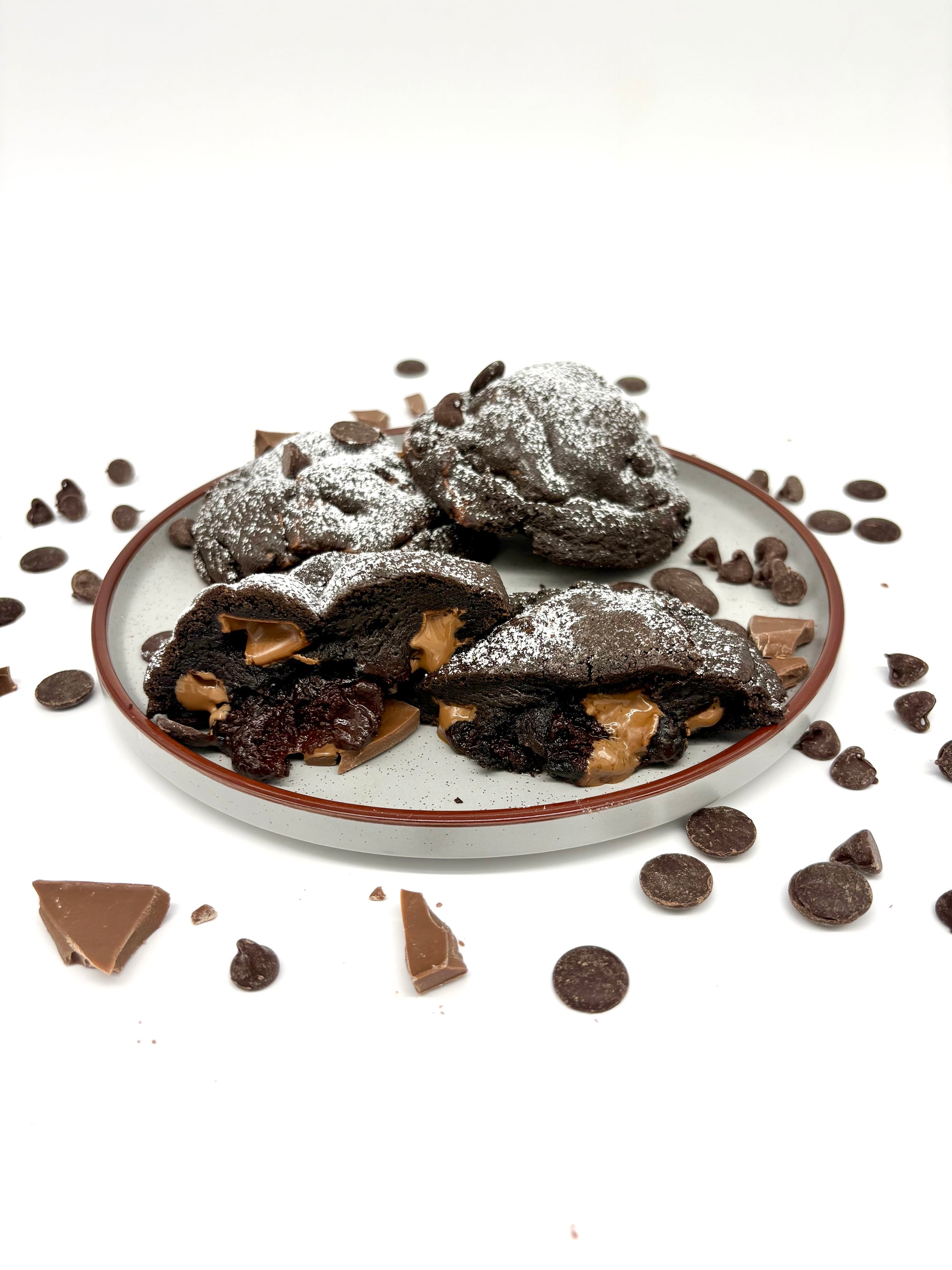 This Molten Lava Cookie is pure chocolate heaven. A deep black cocoa cookie is stuffed with a dark and semi-sweet chocolate ganache, with milk chocolate chunks folded into the dough to perfectly balance the intensity. Finished with a light dusting of powdered sugar, it looks elegant—but the real magic happens when you break it open. Just like the classic molten lava dessert, warm, gooey chocolate spills out with every bite.