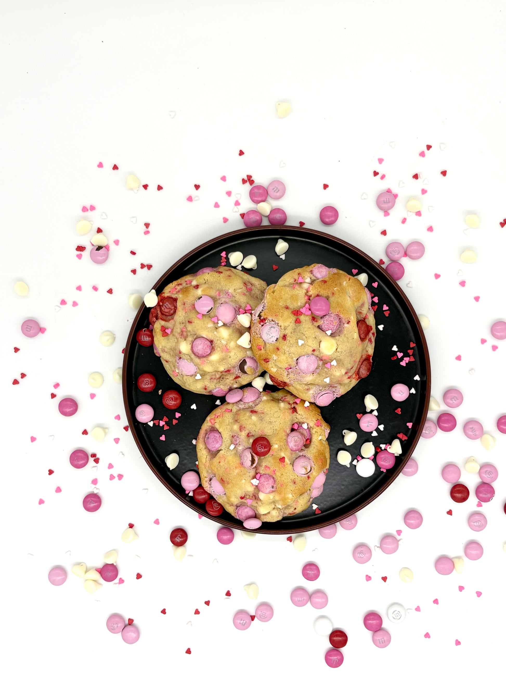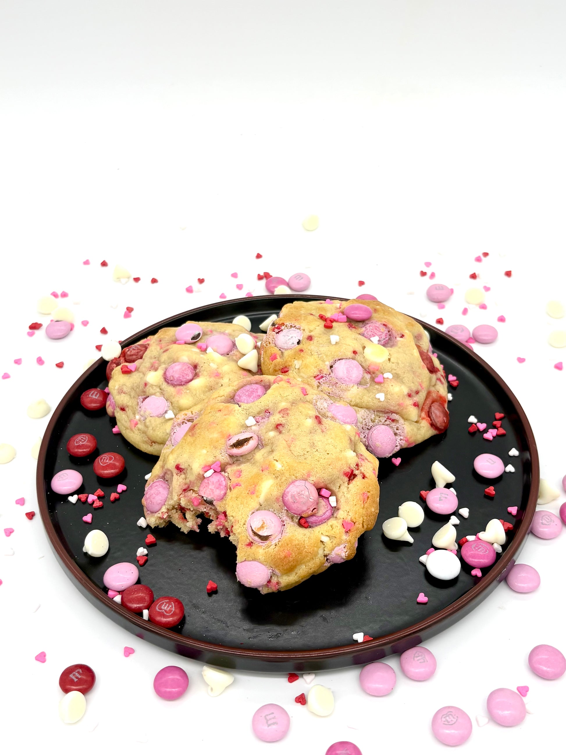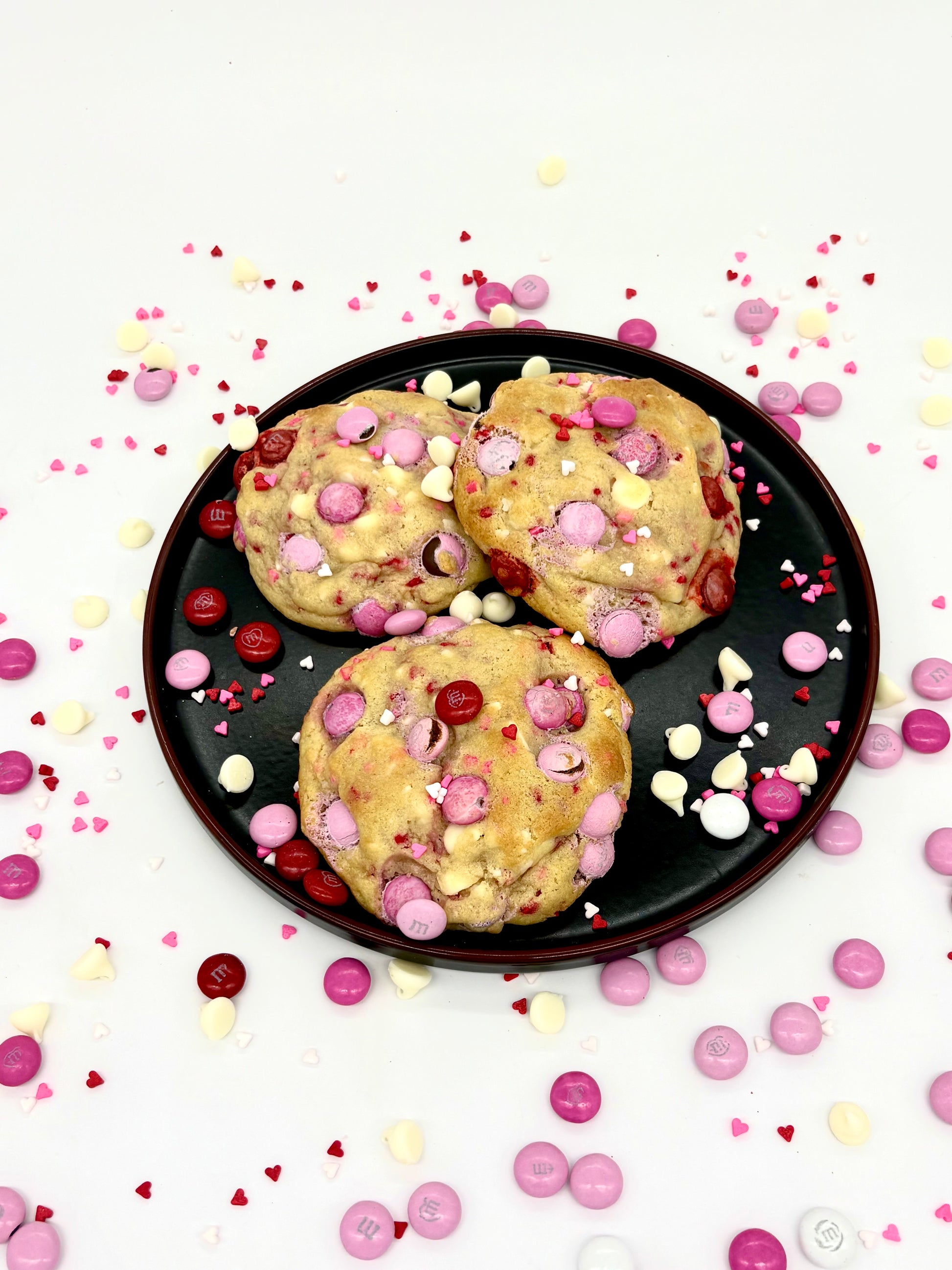 The XOXO Sprinkles Cookie is a Valentine’s Day must. A soft sugar cookie base with a hint of almond extract gives that signature bakery-style flavor, studded with creamy white chocolate chips and festive sprinkles throughout. Finished with colorful M&M’s on top, it’s cheerful, nostalgic, and perfect for sharing (or not).
